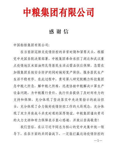????在這場戰(zhàn)“疫”中,中國船舶集團沒有缺席——所屬八院鵬力科技集團緊急承擔平面口罩機、N95口罩機、壓條機等醫(yī)療物資生產(chǎn)關(guān)鍵設(shè)備研制攻關(guān)任務(wù),以“戰(zhàn)時速度”硬核抗疫。近日,中國石油、中糧集團、中國誠通集團等,紛紛發(fā)來感謝信,對鵬力科技集團的全力支持表達深深的謝意。