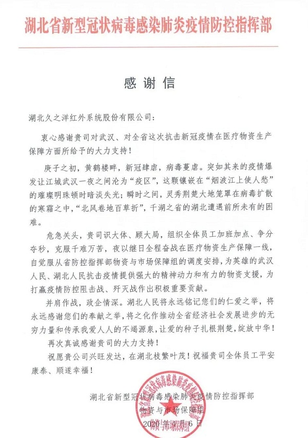 ????信中,對(duì)中國(guó)船舶集團(tuán)七一七所所屬湖北久之洋紅外系統(tǒng)股份有限公司在抗擊新冠肺炎疫情工作中,在醫(yī)療物資生產(chǎn)保障方面給予的大力支持表示感謝。
