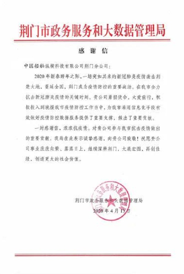 ????中國(guó)船舶集團(tuán)七一〇所縱橫公司荊門分公司收到荊門市政務(wù)服務(wù)和大數(shù)據(jù)管理局寄來的感謝信,感謝其在抗擊新冠肺炎疫情的關(guān)鍵時(shí)刻,為荊門市采用信息化手段有效做好疫情防控?cái)?shù)據(jù)服務(wù)提供了重要支撐,作出了重要貢獻(xiàn)。