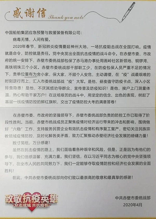 ????中共赤壁市委統(tǒng)戰(zhàn)部特向中國(guó)船舶集團(tuán)旗下中國(guó)應(yīng)急發(fā)來感謝信,對(duì)中國(guó)應(yīng)急員工董有為舍小家保大家,不顧個(gè)人安危,主動(dòng)請(qǐng)纓,在戰(zhàn)“疫”最艱難的時(shí)刻逆行而上表示感謝和致敬。