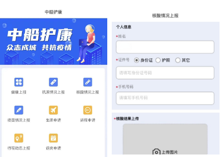 物資公司與樂普(北京)醫療器械股份有限公司合作開發的“中船護康”健康監測上報系統,具備員工健康上報、抗原檢測、核酸情況、疫苗接種、行程動態5種上報模塊,以及出差、返程、返崗3類申請,共8大功能,在數字化防疫方面做出了新的嘗試。