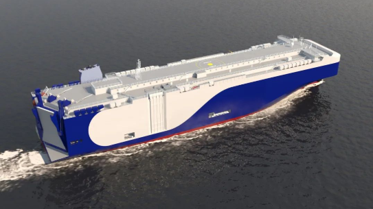 該船型由中國船舶集團旗下上海船院設計,總長200米,型寬38米,裝載能力9000車,可運輸電動車和常規(guī)燃料汽車以及其他類型的重型滾裝貨物。