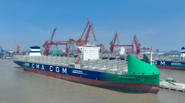 4月9日,中國船舶集團旗下七〇八所設計、滬東中華聯合中船貿易建造的新款清潔能源“海上綠巨人”13000TEU液化天然氣(LNG)雙燃料動力大型集裝箱船“CMA?CGM PARATY”號命名交付。