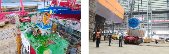 “夢(mèng)想”號(hào)配備的7臺(tái)推進(jìn)器中,3臺(tái)全回轉(zhuǎn)伸縮推是黃埔文沖迄今總成過的最大伸縮推,并且建造過程中伸縮推需要進(jìn)行全程升降試驗(yàn),升降高度差達(dá)4.3米。完成試驗(yàn)的伸縮推總段重量超過了船廠龍門吊最高900噸的起重能力。“夢(mèng)想”號(hào)工藝負(fù)責(zé)人馮仕清創(chuàng)新性地提出了采用龍門吊和履帶吊聯(lián)合吊裝的方法,最終保證了伸縮推的成功安裝。