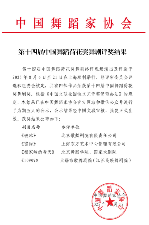 近日,第十四屆中國舞蹈荷花獎舞劇獎評選結(jié)果揭曉,由無錫市歌舞劇院與中國船舶集團(tuán)有限公司旗下第七〇二研究所聯(lián)合創(chuàng)作的原創(chuàng)舞劇《10909》從眾多優(yōu)秀作品中脫穎而出,成功摘得荷花獎舞劇獎。