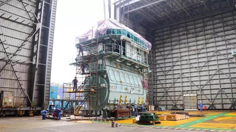 1號船塢里,4層樓高的主機(jī)吊裝完成